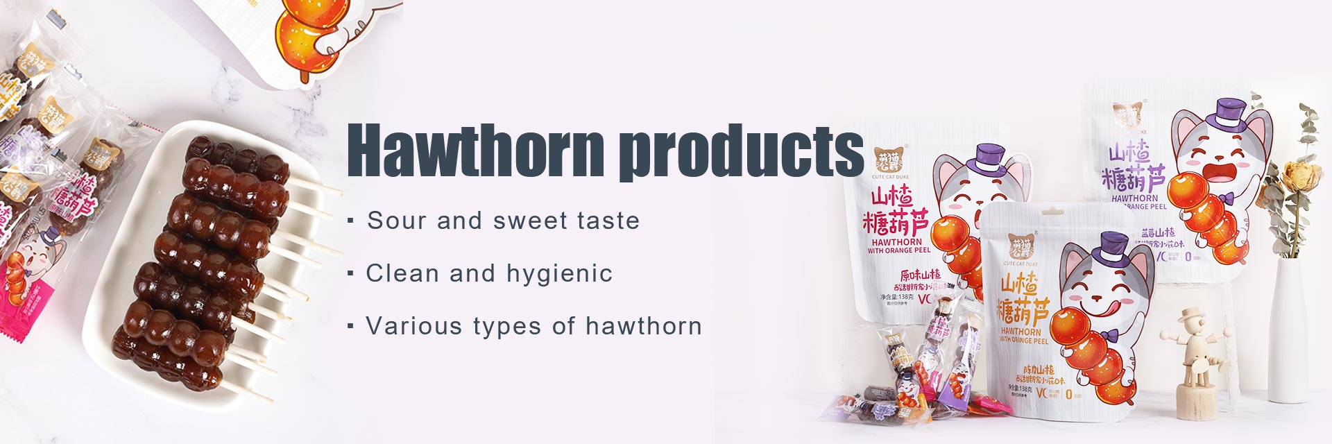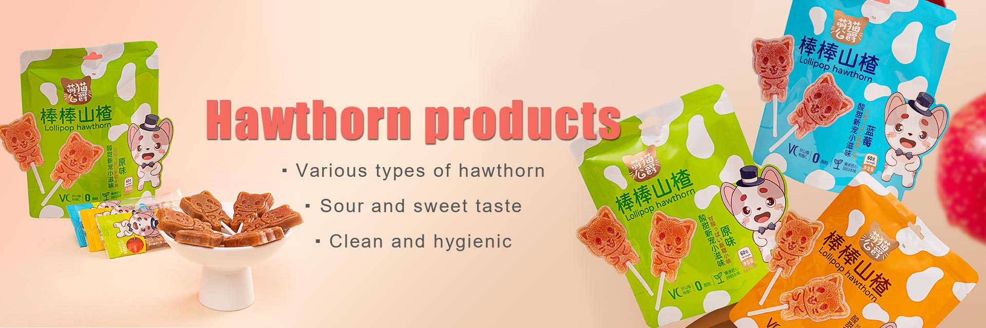 Main products: functional hawthorn series, fruit hawthorn series, flesh hawthorn series, stick hawthorn series, fruit hawthorn cake series, traditional hawthorn series, as well as various high-quality hawthorn products such as candied fruits, preserved fruits, dried fruits, etc